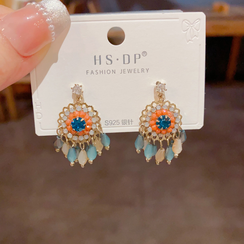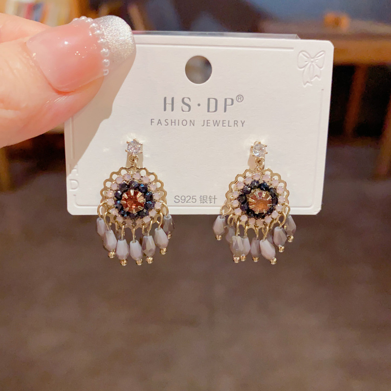 Color: purple diamond round crystal tassel earrings (thick gold plated), Blue Diamond round crystal tassel earrings (thick gold plated)